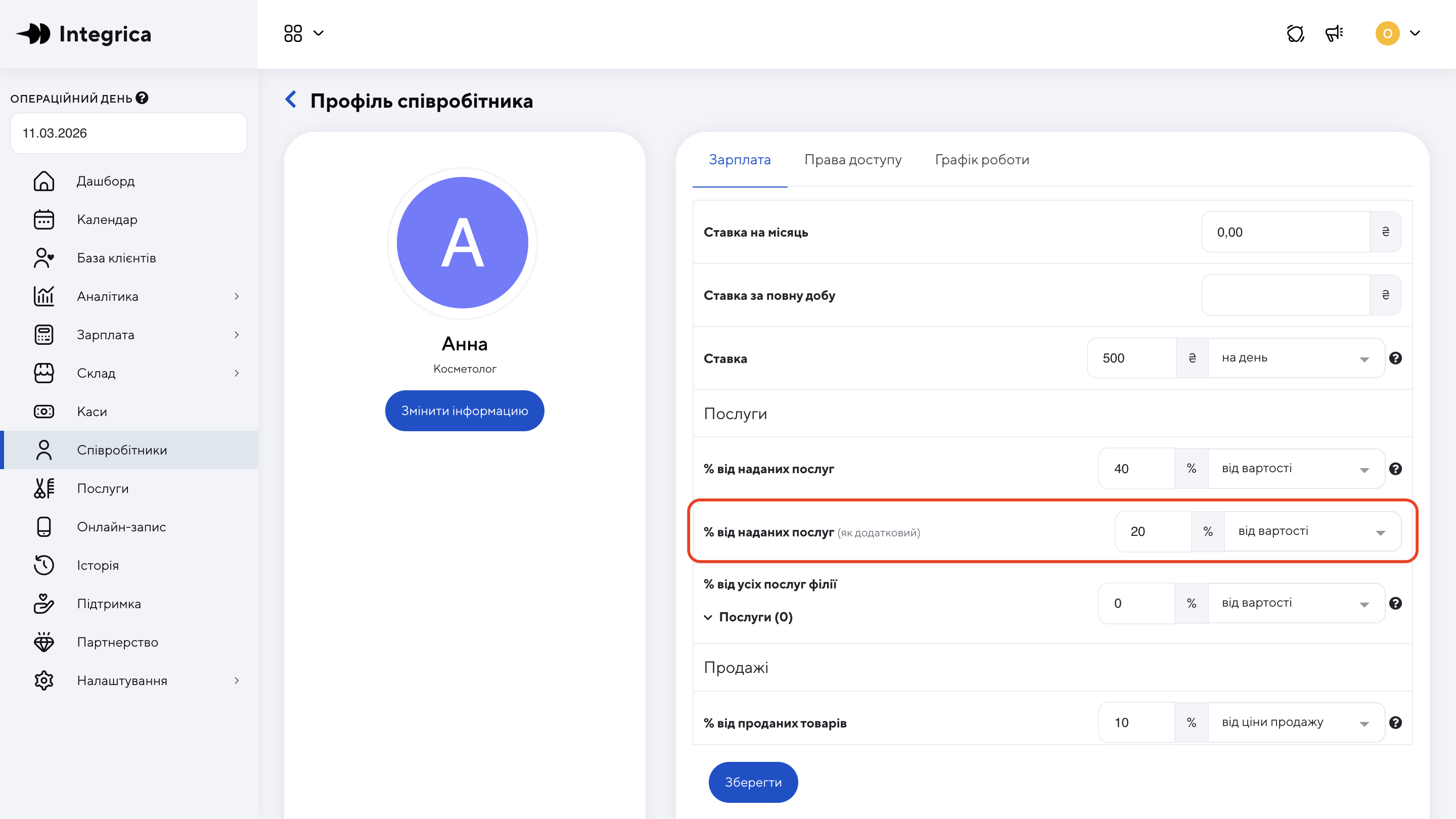 Якщо додатковий спеціаліст завжди отримує однаковий відсоток від послуг, це можна налаштувати у його картці.