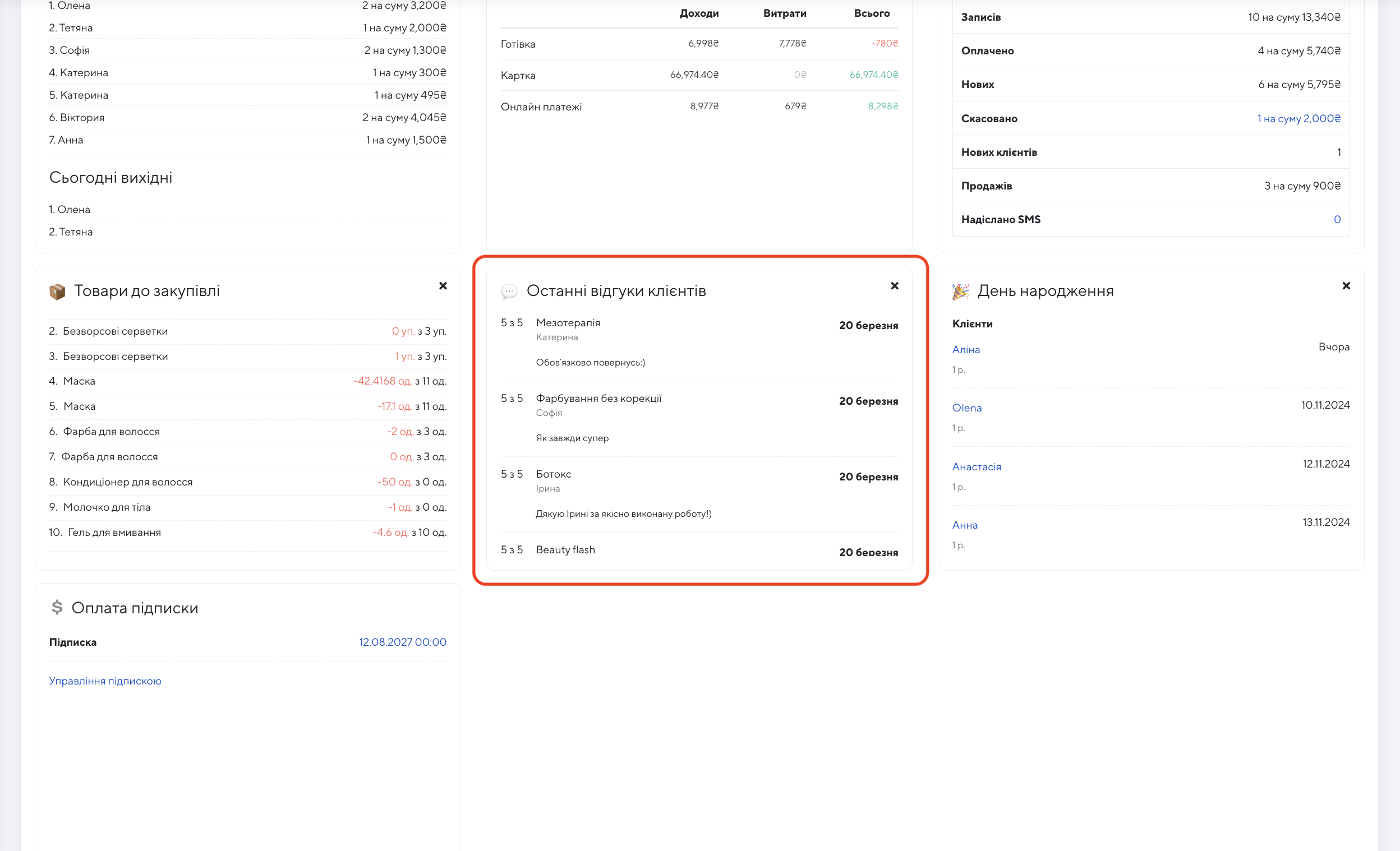Дашборд містить блок «Останні відгуки клієнтів», який відображає найновіші відгуки для оперативного контролю сервісу. Це допомагає адміністраторам і керівникам швидко реагувати на коментарі, підтримуючи високий рівень якості послуг.