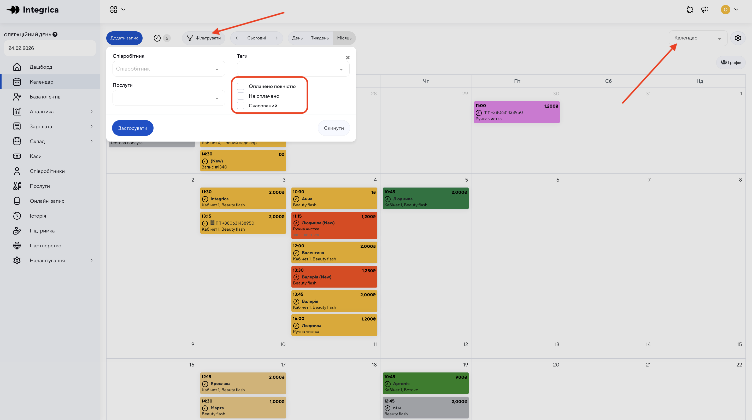 - Оберіть тип календарю "Календар" - відображення місяць, тиждень, день