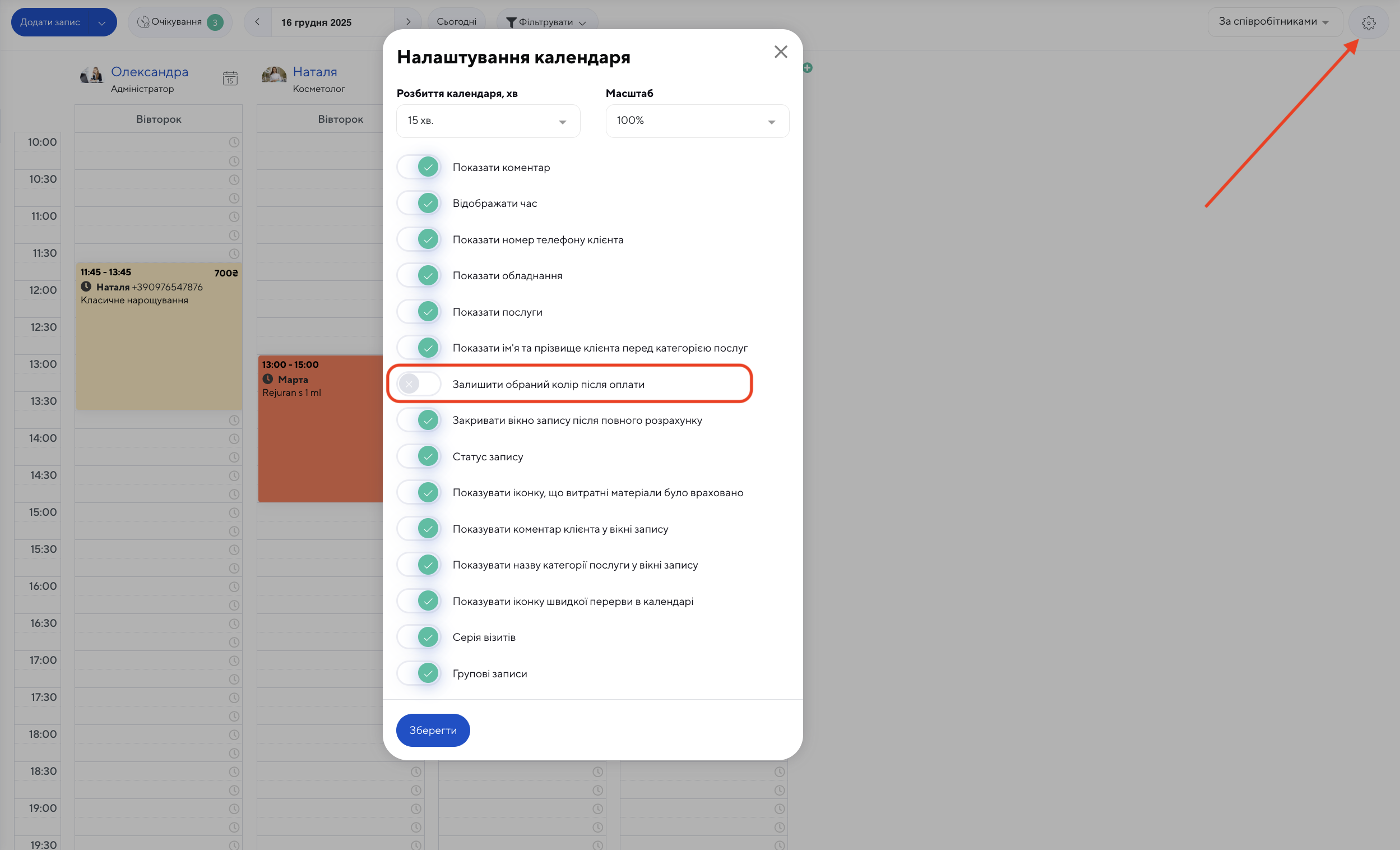 Щоб після проведення оплати запис у календарі автоматично змінював свій колір, необхідно змінити налаштування календаря.