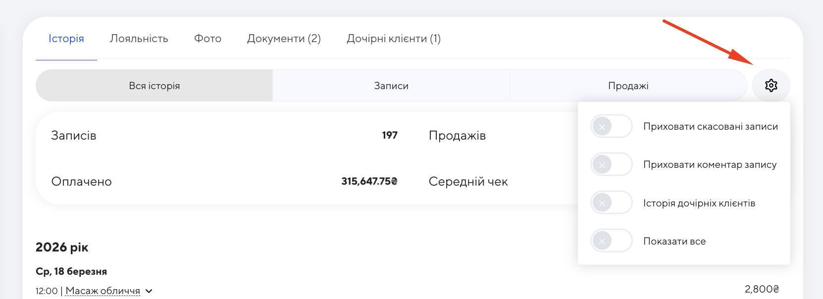 У вкладці "Історія" також можна переключатись між різними типами даних: вся історія, записи, продажі. Це допомагає окремо переглядати саме візити або, наприклад, тільки покупки клієнта.