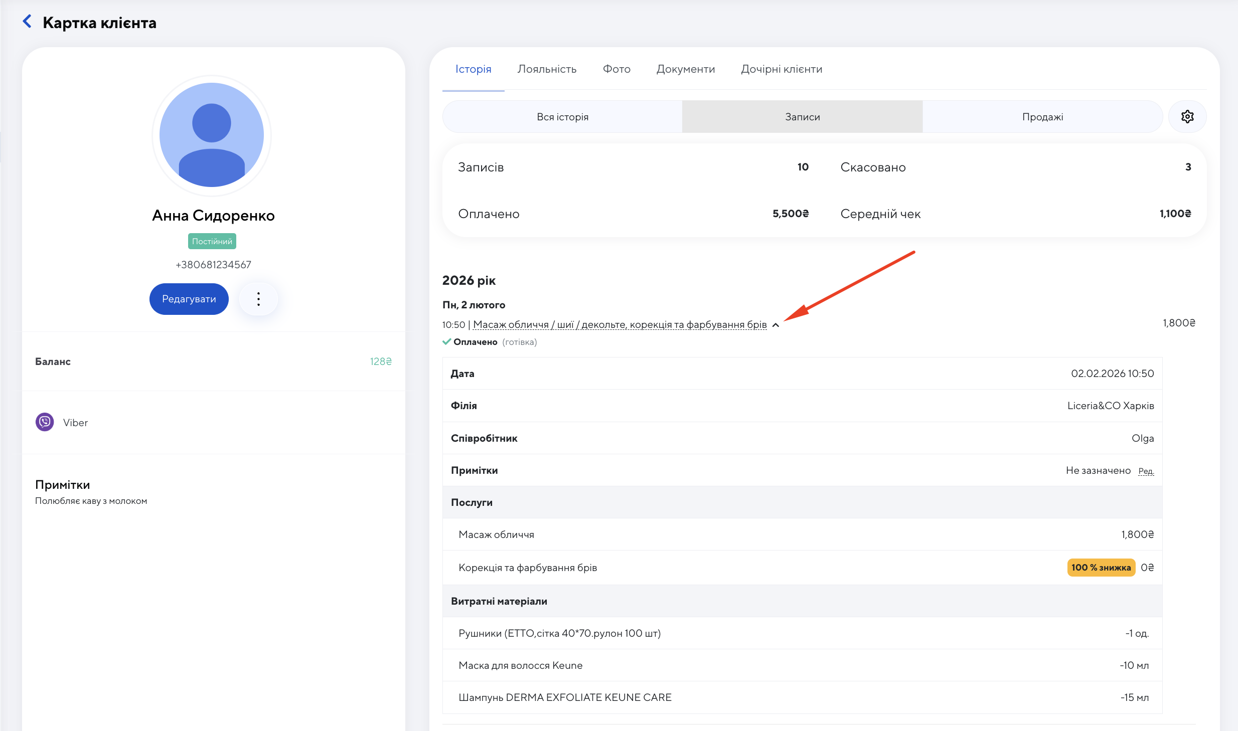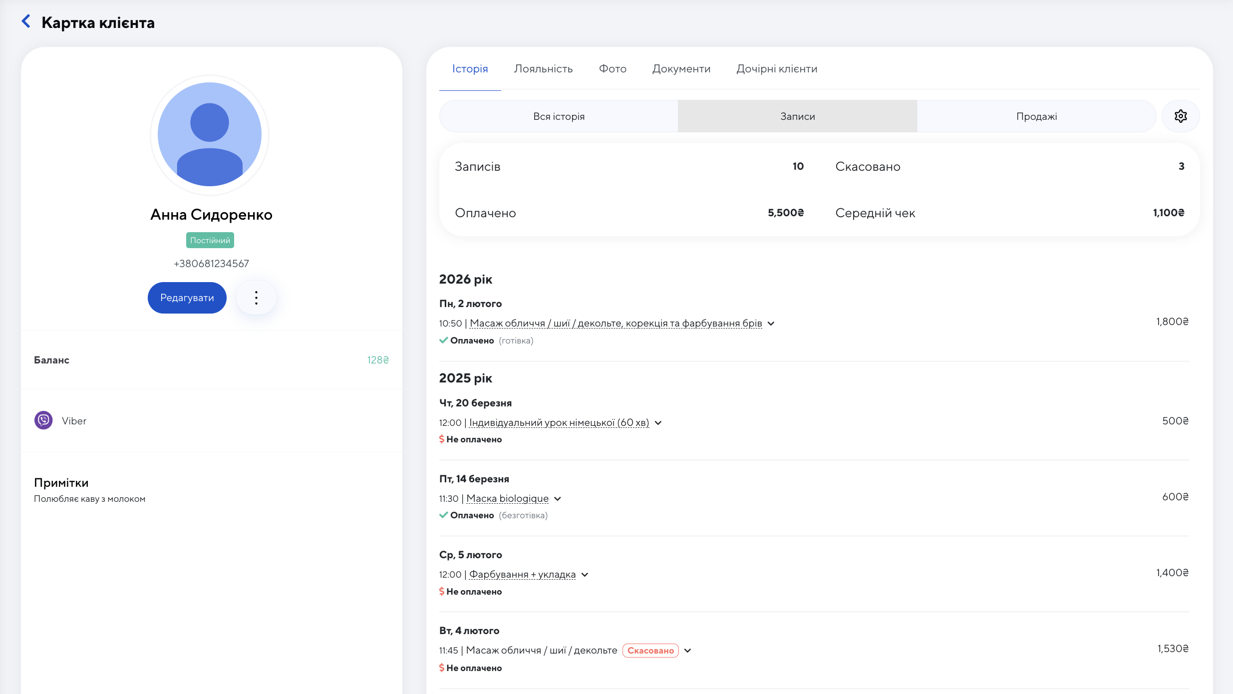 Історія візитів у картці клієнта допомагає швидко переглянути, коли клієнт приходив, на які послуги був записаний, до якого спеціаліста та які записи були скасовані або завершені.