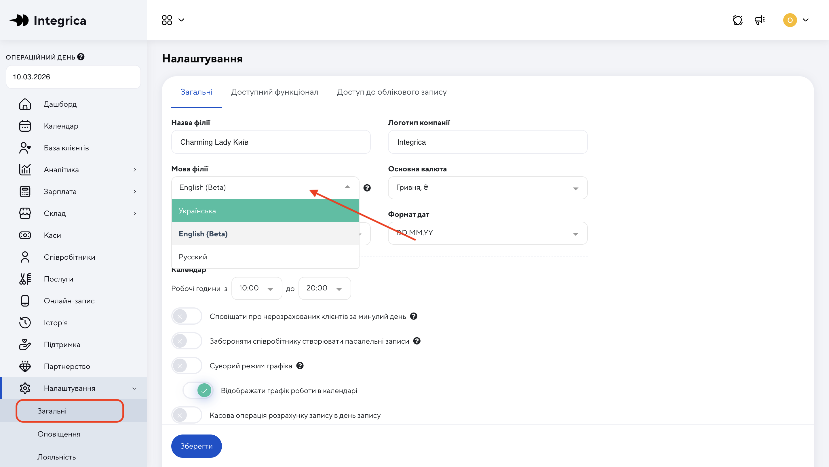 Важливо: при цьому змінюється мова системних текстів і повідомлень, але інтерфейс програми для співробітників не змінюється автоматично.