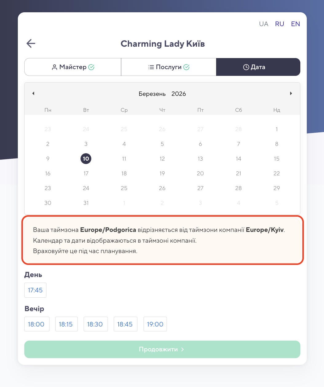 У такому випадку система повідомить про різницю в часі, щоб клієнт випадково не записався на неправильний час.