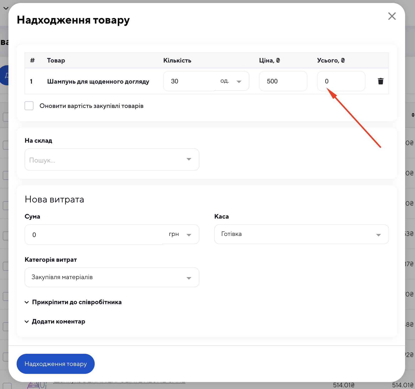 Після цього товар буде додано на склад у потрібній кількості, але касова операція створена не буде і кошти з каси не спишуться.