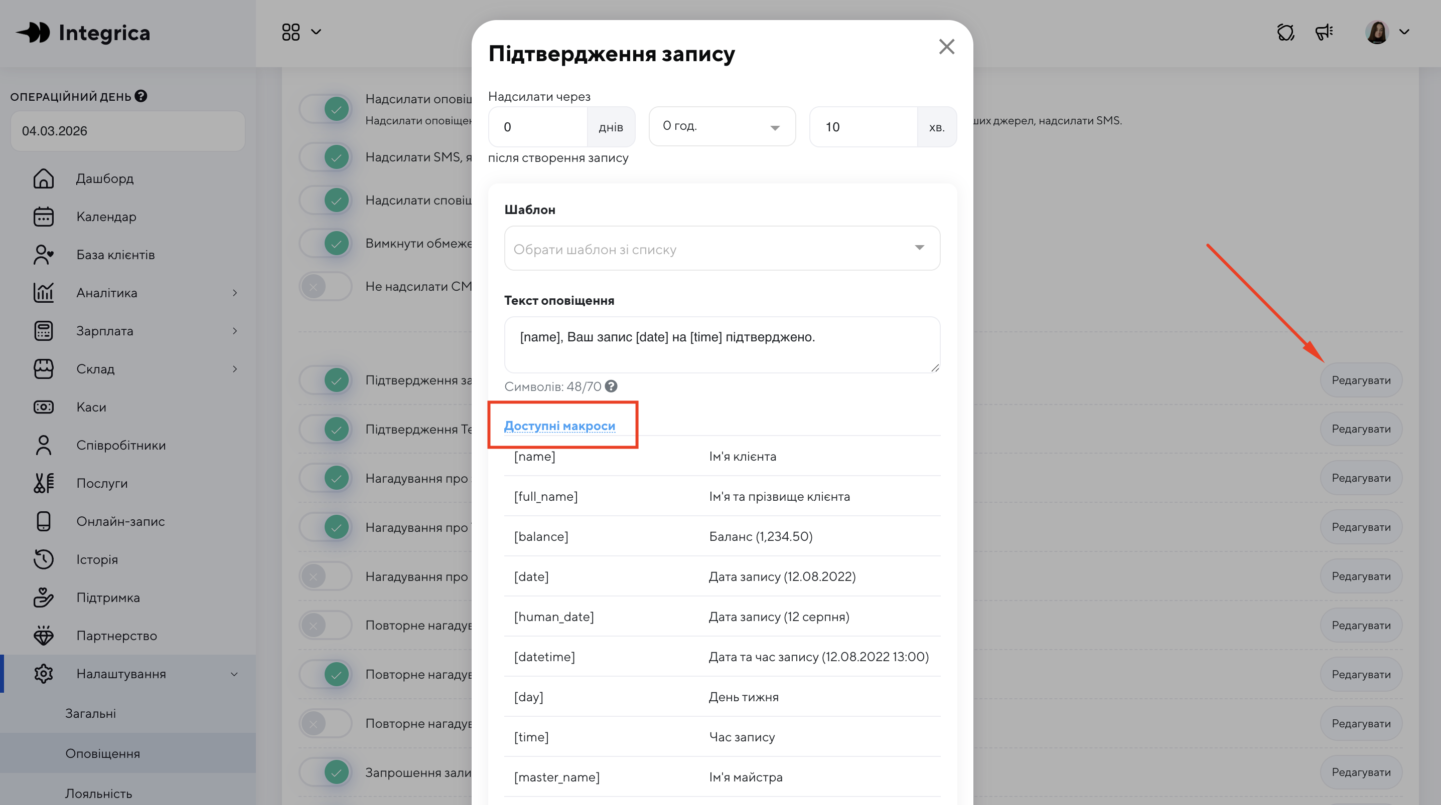 Макроси дозволяють автоматично підставляти дані з CRM у текст повідомлення. Завдяки цьому повідомлення стають персоналізованими, а адміністратору не потрібно вручну вводити інформацію про клієнта або запис.