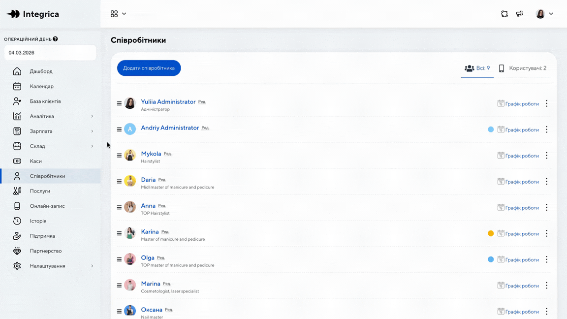 У системі ви можете змінити порядок, у якому співробітники відображаються в календарі та онлайн-записі. Це дозволяє зручніше організувати роботу команди та показувати співробітників клієнтам у потрібному порядку.